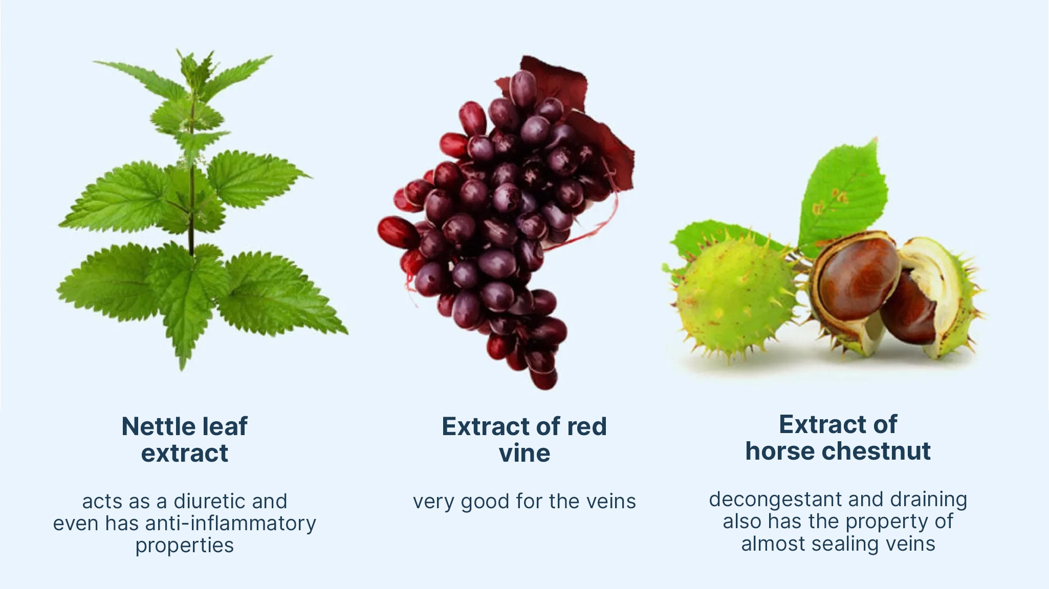 D: Drainage. To get rid of water retention, you need to sustainably drain the body without losing potassium and other salts. Nettle leaf extract promotes the urge to urinate, while red wine leaf extract helps remove excess water from the tissues. Horse chestnut extract, in turn, helps reduce swelling in the legs.