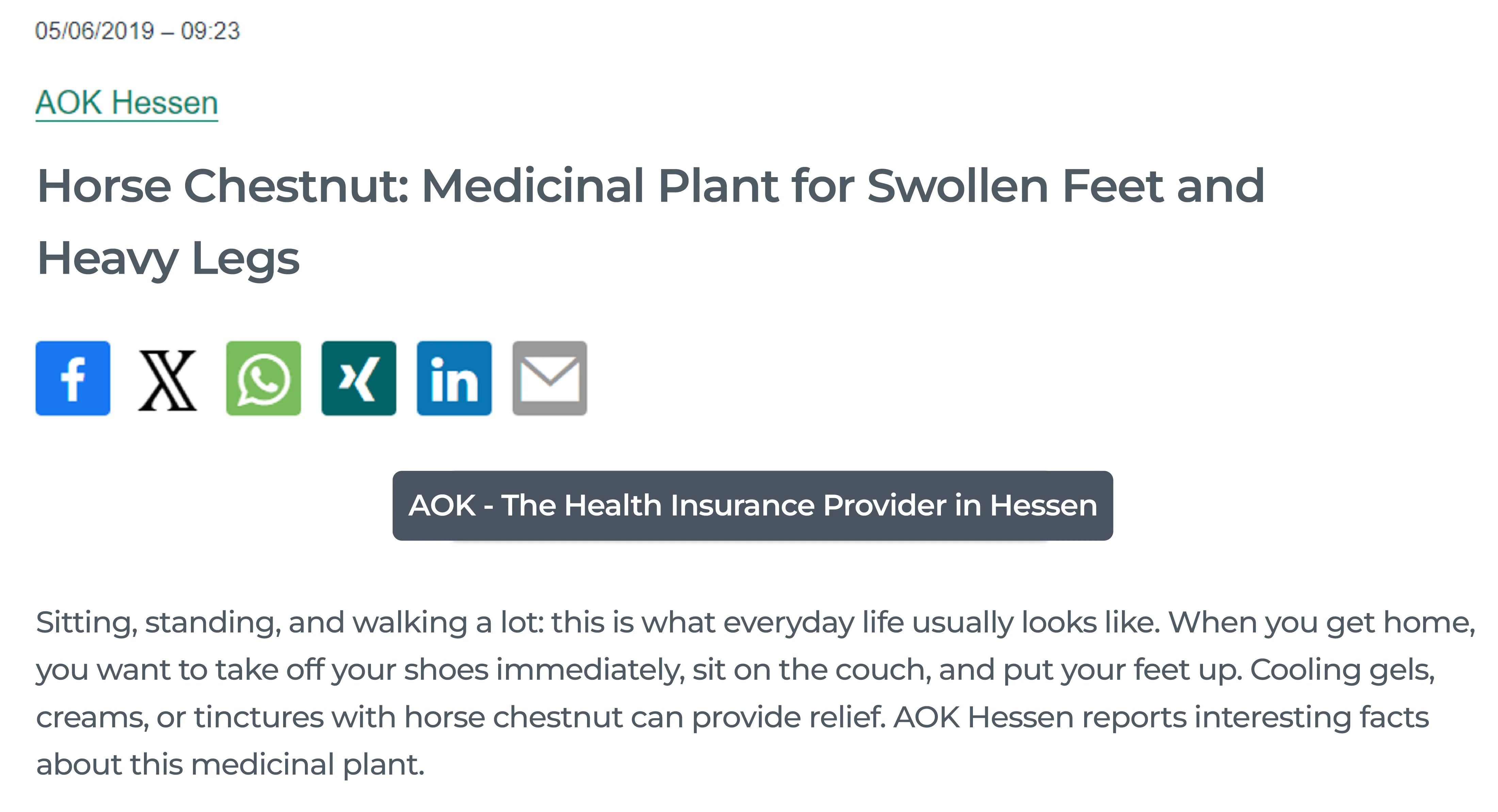 When I later looked into the subject myself, I even found an article from the health insurance fund AOK Hessen, in which horse chestnut extract is recommended as a home remedy for fluid retention and heavy legs: