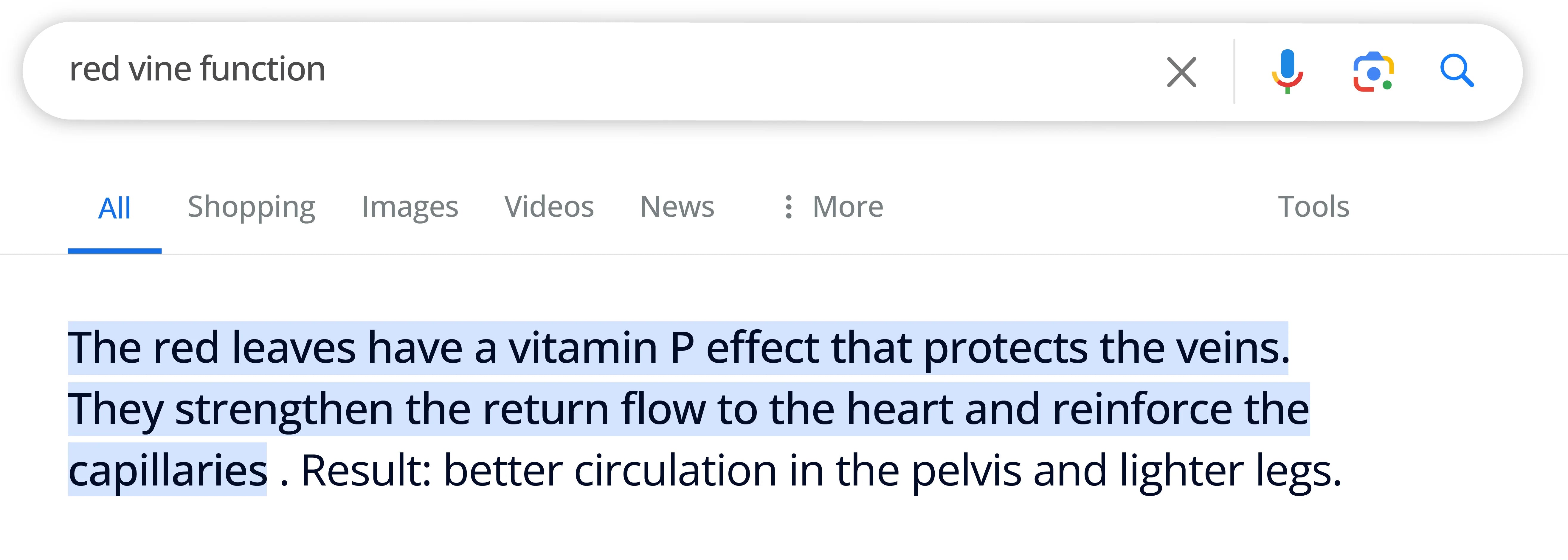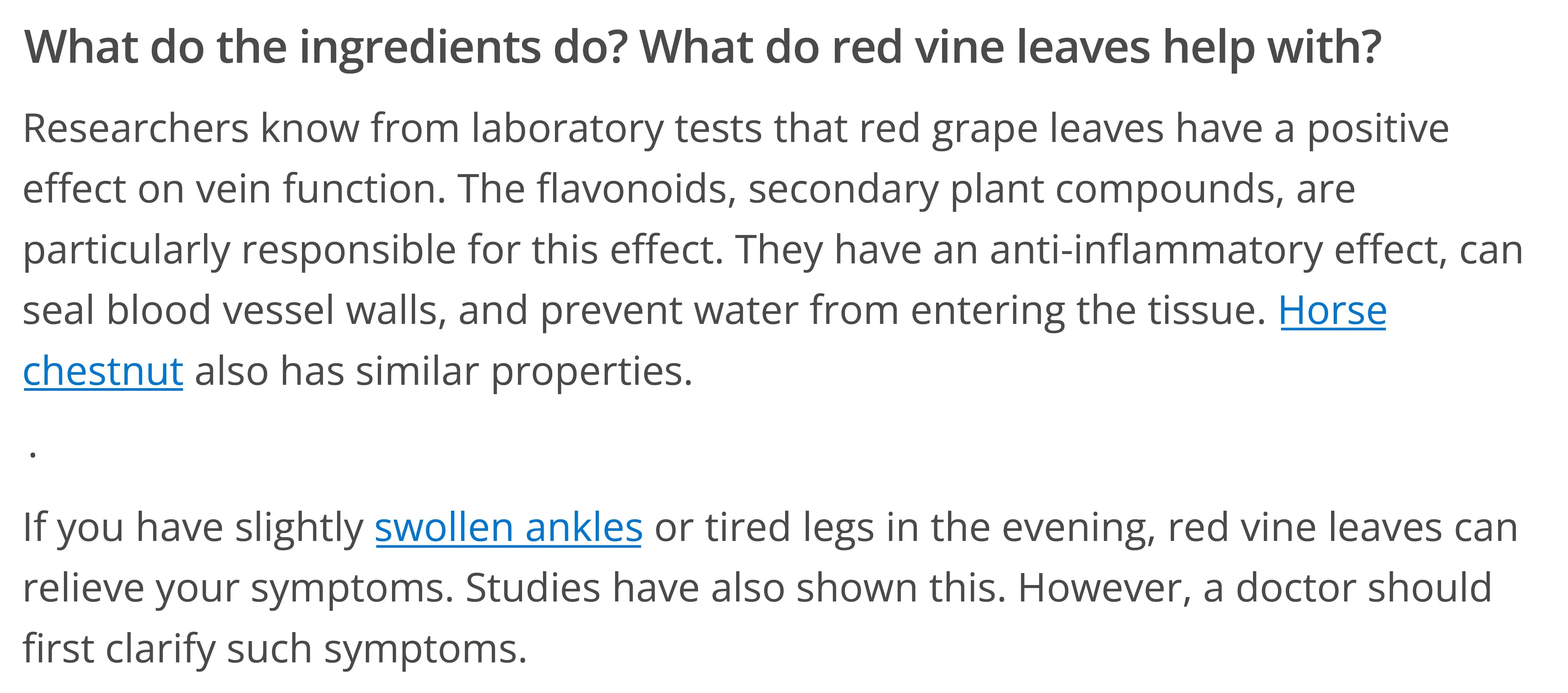 But if you Google it, you will find numerous results saying that red vine leaf extract is very good for the veins.